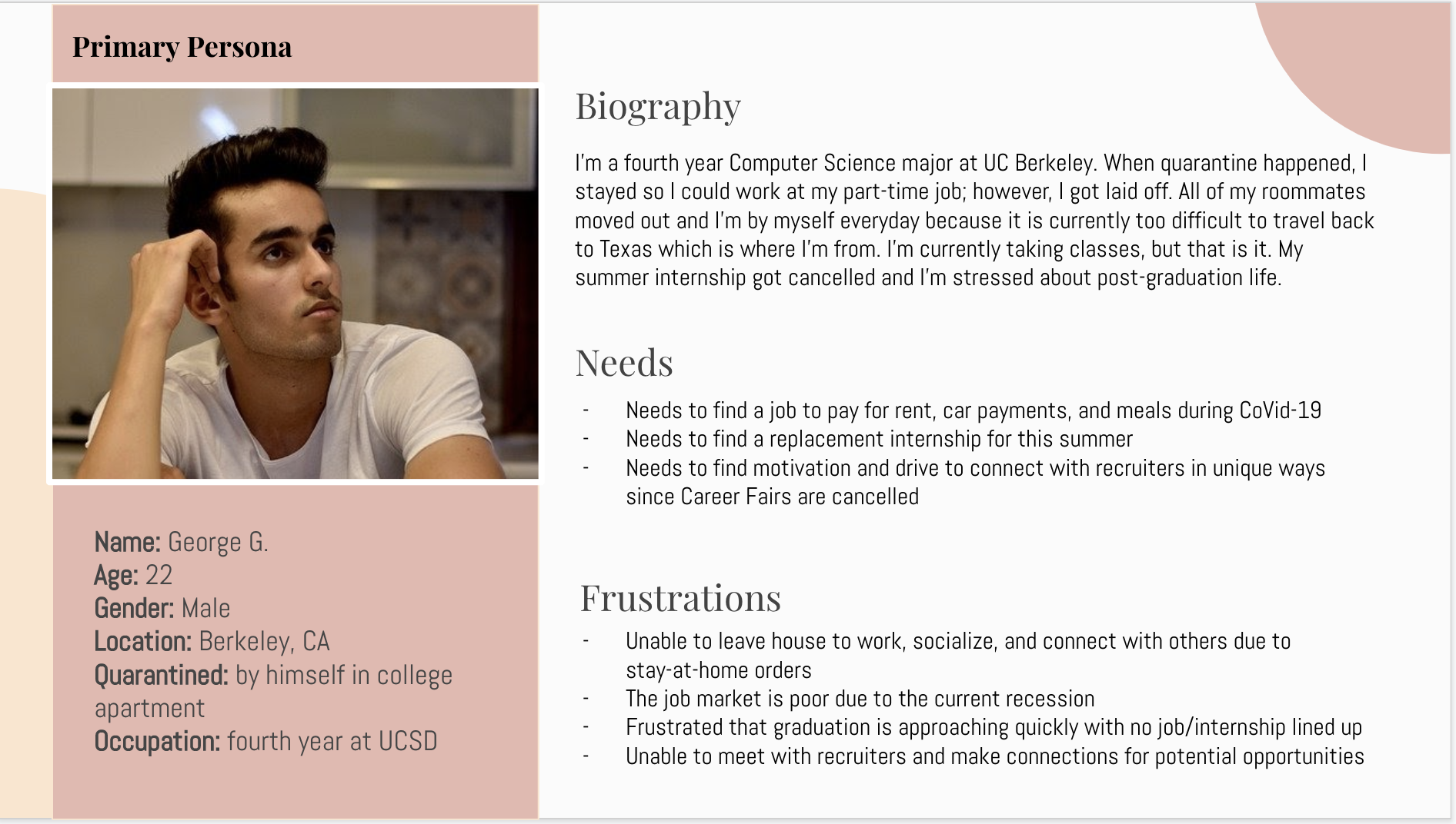 Our primary persona is George who has been hit hard by the COVID situation. He is a college student at Berkeley, but has decided to stay back in the college apartment to make ends meet. George has recently felt very unmotivated and doesn’t know how to navigate his virtual surroundings in order to gain opportunities. He is looking for an outlet to expand his skill set in Computer Science field with a possible internship rather than part time job.