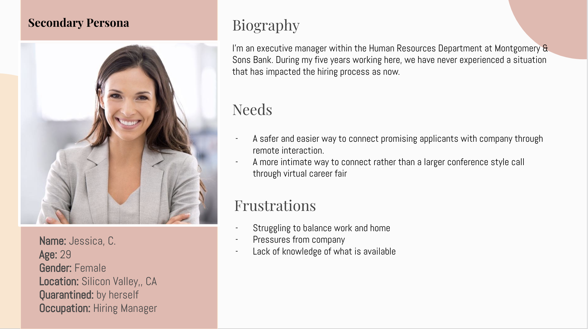 Our secondary persona is Jessica who is a hiring manager at a bank. Her company doesn’t have the correct protocol to handle the hiring process during the pandemic and is putting pressure on Jessica to find an alternative. Jessica is stressed by this and would like some sort of easier way to integrate the traditional career fair experience with the company while still being safe.