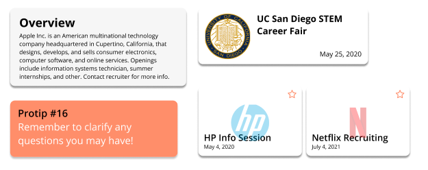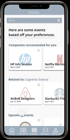 After completing the onboarding process, the information that was inputted during the completion of the users profile generates events involving their major, location, preferred companies and university. Here, users can see what companies, positions and speakers important in their field of study are having sessions in order to reach out and gain connections.