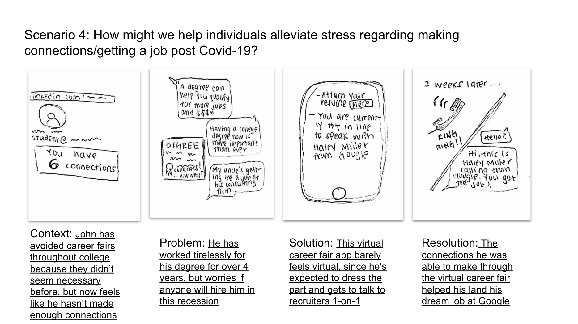 Our stakeholder interview showed preference to a sort of virtual career fair opportunity that would be helpful to them in their situation right now out of all the other storyboards presented to them. This storyboard follows a student, John, who participated in an online virtual career and had the opportunity to connect with a recruiter. There, he was able to apply for an opportunity and land his dream job. Many stakeholders agreed that this is one if their main stressors right now in the pandemic, and majority leaned into the possibility of a virtual fair app.