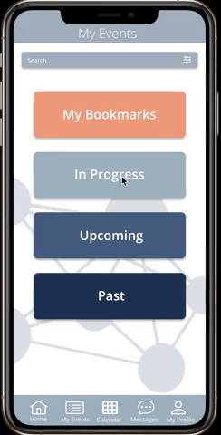 After browsing the Home Page and finding an event the user wants to attend, they can save the event in the ‘My Events’ page. When entering My Events from the bottom navigation bar, they come upon the main page with 4 different accessible types of events. There is the ‘My Bookmarks’ tab where individuals can store events they are interested in, the ‘In Progress’ tab with events that they have signed up for that are currently open in real time, the ‘Upcoming’ tab with future events the user has registered in, and finally the ‘past’ tab with information about the history of concluded events that they already attended. During in-person career fairs, company, files and physical notes/business cards can get overwhelming and easily lost among each other--but having a virtual setting could offer much simpler organization, as contact and event information are stored on CareerGo itself.