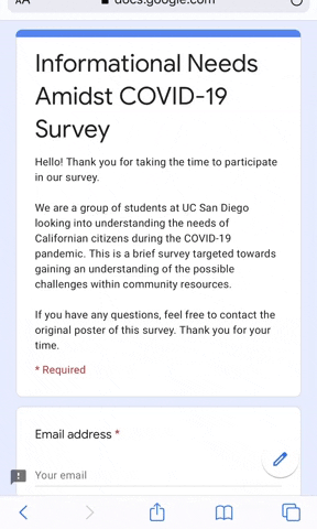 I was apart of a team of designers originally focusing on how to support communities affected by Covid-19. We sent out a questionnaire through social media and email, regarding informational needs on the pandemic. We focused on questions about information needs followed by some demographic questions so we could get a better idea of the current struggles people were dealing with around us. Most of our questions in this stage were quite vague in order to figure out if we could find a pattern or a deeper problem among people from having them talk about their everyday experiences.