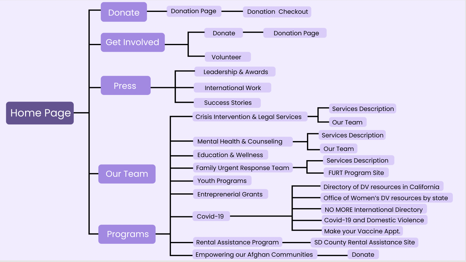 Through competitive analysis, I placed the ‘Donate’ at the right end of the page grouped with the ‘Get Involved’ page while i grouped ‘Programs’ and ‘Our Team’ together. When creating the buttons, I titled them using the title of the resource articles to increase cognitive offload when accessing information fast.