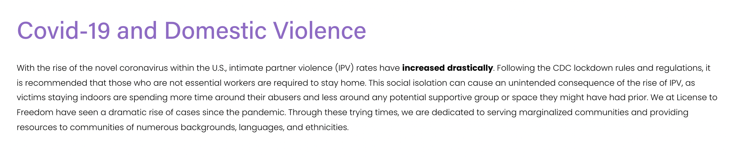 At the time, with Covid-19 having much of the general public quarantined, my supervisor reported that there has been a very rapid number of restraining order and domestic abuse cases rising since quarantine that has kept her and her staff very busy. They do not have the time to comb through foundation grants. I decided to redesign License to Freedom’s website in order to make the whole user experience process more intrinsic for those visiting the site. The new website launched at the end of June, along with a social media and email campaign.